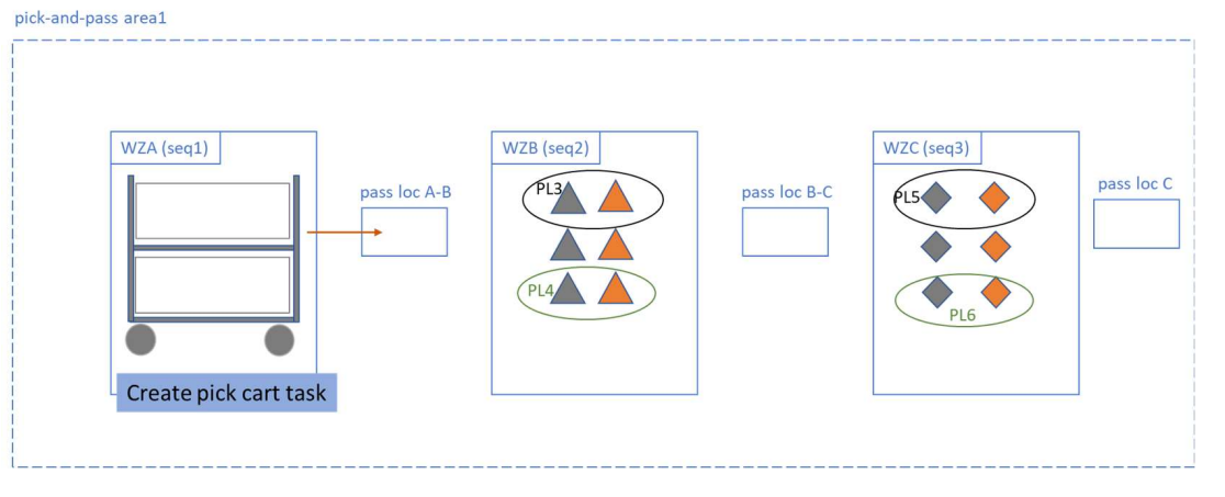 In this flow, for Order 1 and Order 2, the inventory is located exclusively in work zones B and C, with no inventory in work zone A. To accommodate this scenario, the picking process involves an additional task of creating an empty pick cart for work zone A, which is then sent to the designated drop-off location. The main inventory picking process occurs in work zones B and C and follows the typical multi-order pick list creation for each of these zones.