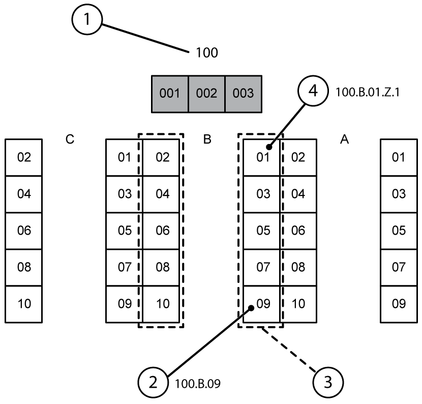 For example: In warehouse 100 (1) a pick zone (3) is created in aisle B to pick 30 types of regional beers. 5 racks (2) are created with 15 locations (4) in total. Therefore, maximum 15 regional beers can be placed for picking. If, for example, there is a promotion for a regional beer, 5 extra locations can be created for the promoted beer. Other beers will have to be moved to make room. In other words, space is created in the pick zone.